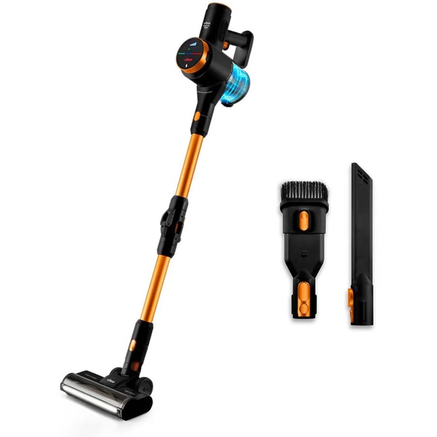 Motor digital brushless Potencia máxima 300W Voltaje: 25.6V Batería Li-ion extraíble de 2200mAh Tiempo de carga de 4h Autonomía hasta 40 min Presión máxima de aspiración: ?25KPa Capacidad del depósito de polvo: 0,5L Cepillo motorizado con luz Power Led XL 3 potencias de aspiración: Eco, Medio, Alto Pantalla digital táctil Accesorios incluidos: herramienta larga para hendiduras y esquinas, cepillo 2 en 1 para muebles y accesorio para montaje en pared