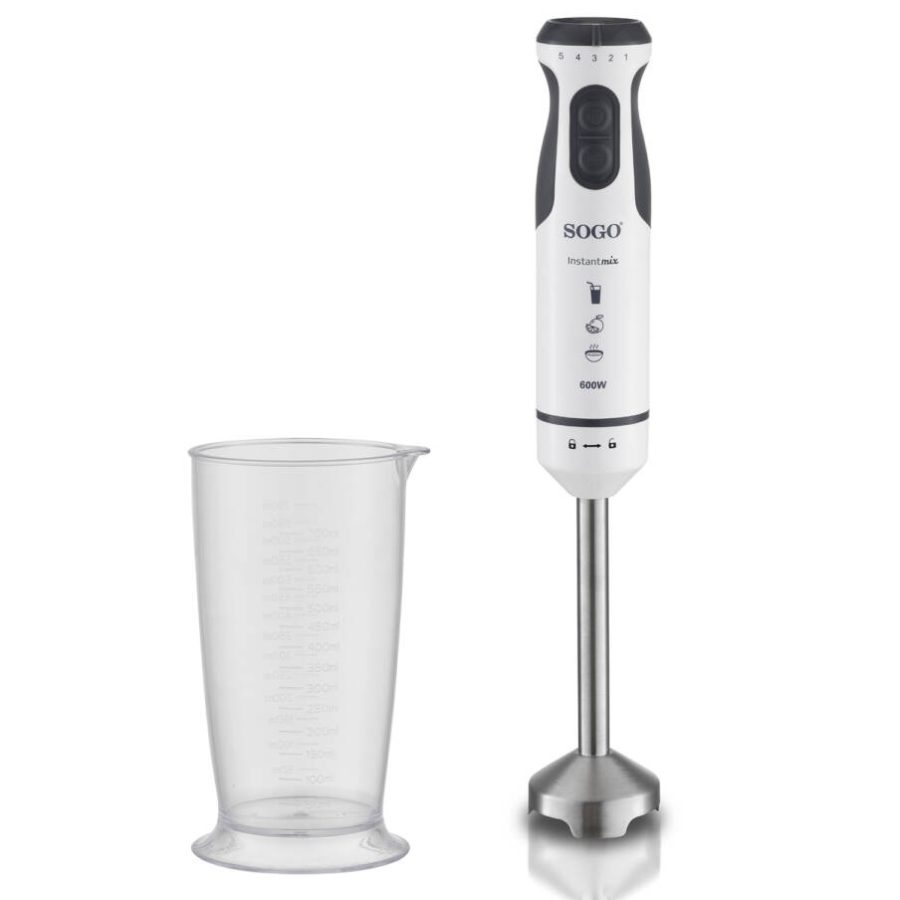 Batidora de mano con potente motor para licuar, mezclar y moler una amplia variedad de alimentos ? 600W ? Diseño ligero y motor silencioso ? Pulsador con dos velocidades para operaciones normal y turbo ? Perilla de velocidad con control variable hasta 5 velocidades ? Varilla y cuchillas de acero inoxidable para un trabajo eficaz ? Incluye: Jarra de plástico sin BPA de 700 ml de capacidad con indicaciones de medidas. ? Fácil de montar / desmontar