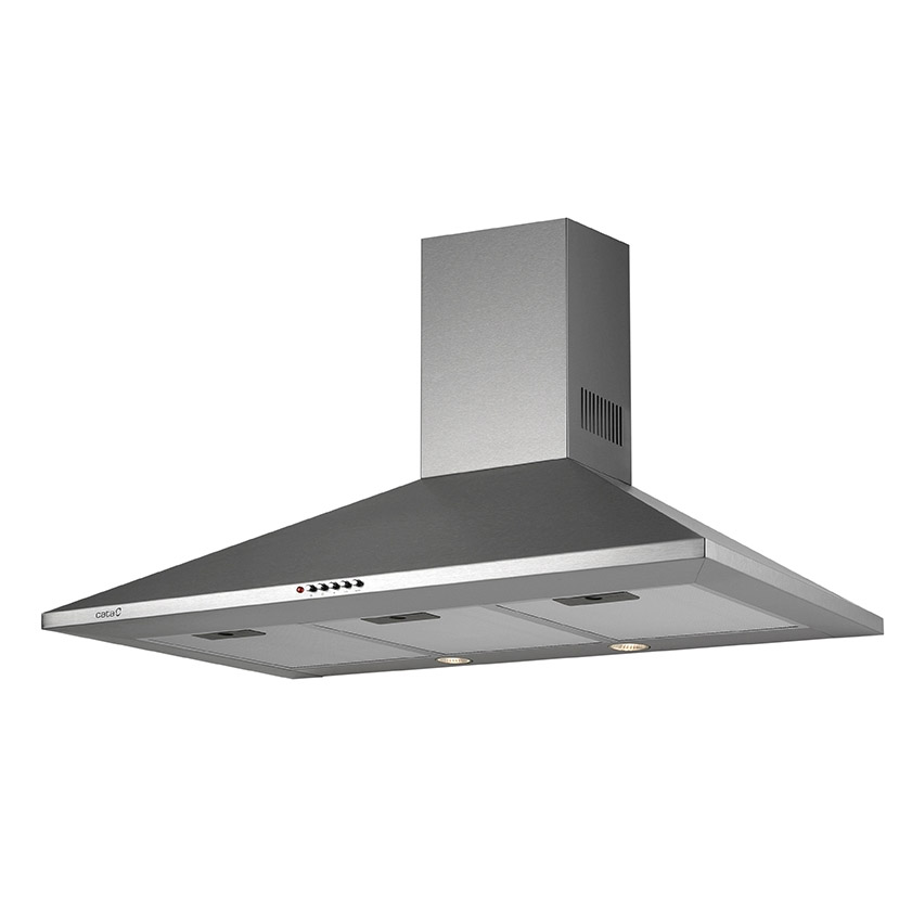 Campana decorativa de pared piramidal de 90cm con acabado en inox. Panel de Control Mecánico. 3 niveles de extracción. Capacidad de extracción máxima ?mínima (Reg.(UE) nº65/2014): 645m3/h – 385m3/h. Nivel sonoro (Reg.(UE) nº65/2014): 58dB(A), máximo: 72dB(A). Motor M3R. Extra silencioso. Consumo máximo de energía 270W. Iluminación de alta eficiencia mediante TIRA LED compacta. Clase de eficiencia energética: C