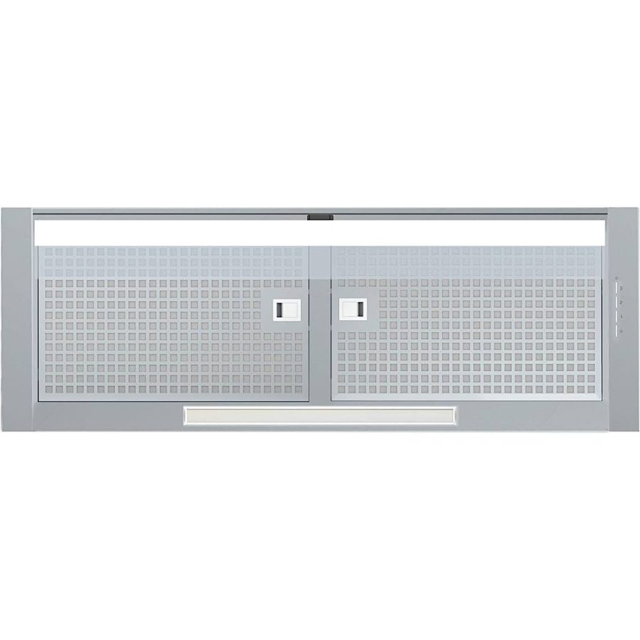 Campana integrable para mueble de 90cm con acabado en inox y visera cristal. Panel de Control Electrónico con temporizador de desconexión automática. 3 niveles de extracción, 2 + 1 TURBO. Capacidad de extracción máxima ? mínima (Reg.(UE) nº65/2014): 850m3/h – 340m3/h. Nivel sonoro (Reg.(UE) nº65/2014): 50dB(A), máximo: 65dB(A). Motor BT3. Extra silencioso. Consumo máximo de energía 283,5W. Iluminación de alta eficiencia mediante TIRA LED. Clase de eficiencia energética: A