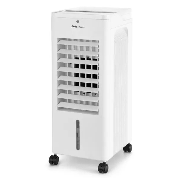 Panel de control táctilFunción fría, ionizado y ventilador2 posibilidades de llenado de agua:- Desde la tapa superior- A través del depósito de aguaCapacidad de depósito de agua: 7LTemporizador hasta 12 horasVisualización de la temperatura ambienteen el panel de control3 velocidades3 modos: normal, natural, nocheFiltro de aire lavableOscilación horizontal automáticaMando a distanciaIncluye 2 bloques de hieloAsa de transporte y ruedas65W
