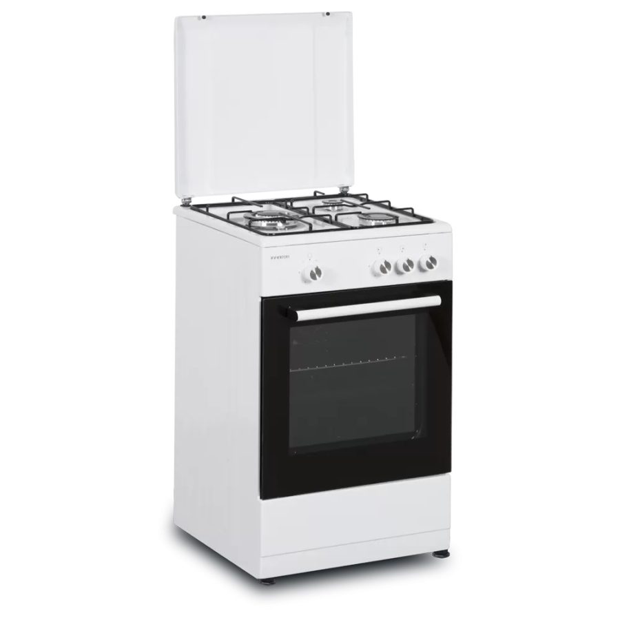 COCINA DE GAS BLANCA 3 fuegos, 50 ancho (86x50x55,5 cm), 1×3.0KW, 1×1.75KW, 1×1.0KW, HORNO: 43 L, Quemador Inf 2,50 kW, Grill Gas ? Doble Puerta Vidrio Horno, Quemadores con Seguridad, Control Temperatura Mecanica