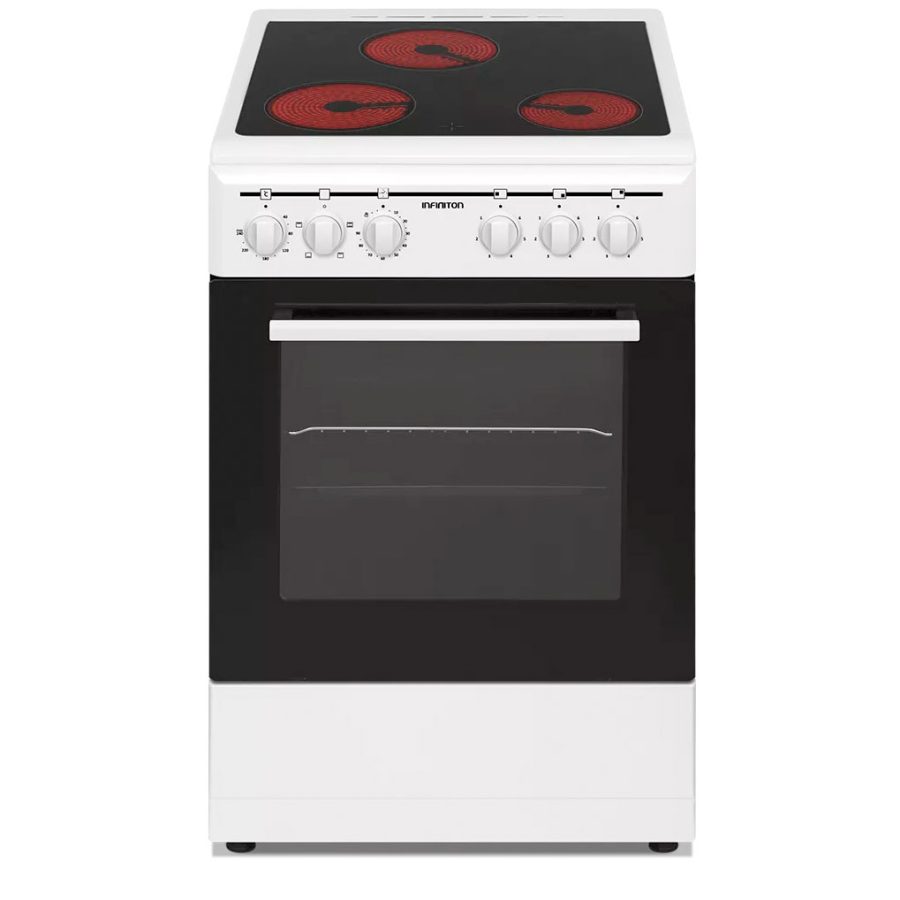 Superficie de cocción CRYSTAL BLACK Vitrocerámica de 3 zonas Zona Grande (W) Ø18 cm / 1700 Zona Mediana x 2 (W) Ø14 cm / 1200 6 niveles de potencia por zona Horno eléctrico con capacidad de 43 Litros Control de temperatura mecánico (40-240º C) 4 funciones: – Calentador superior – Calentador inferior – Calentador convencional – Grill Temporizador mecánico (0-90min) Puerta de DOBLE acristalamiento Accesorios de horno: – Bandeja – Rejilla Colocación frontal de los mandos de alta calidad Sin tapa superior Capacidad del horno (L) 43 Temperatura de trabajo (ºC) 40-240 Quemador inferior del horno (W) 1815 MEDIDAS Alto x Ancho x Profundo: 85 x 50 x 55,5