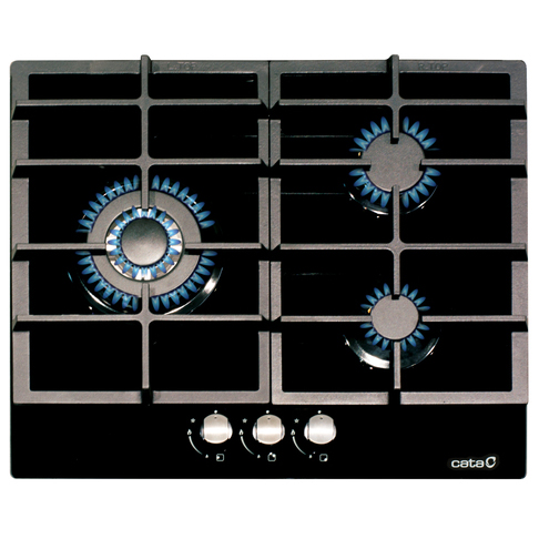 Cristal Sistema de anclajePletinas fijación Anchura del aparato mm 590 Profundidad del aparato mm 510 Altura del aparato mm 52 Anchura del hueco mm 555 Profundidad del hueco mm 475 nº de quemadores 3 Encendido eléctrico integrado en mando Válvula seguridad Parrillas / Quemadores hierro fundido Preparada para gas butano Triple Corona1 x 3,5kW Semi-rápido1 x 1,75kW Auxiliar1 x 1kW Potencia del aparato (kW)6,25 kW3 quemadores de gas: