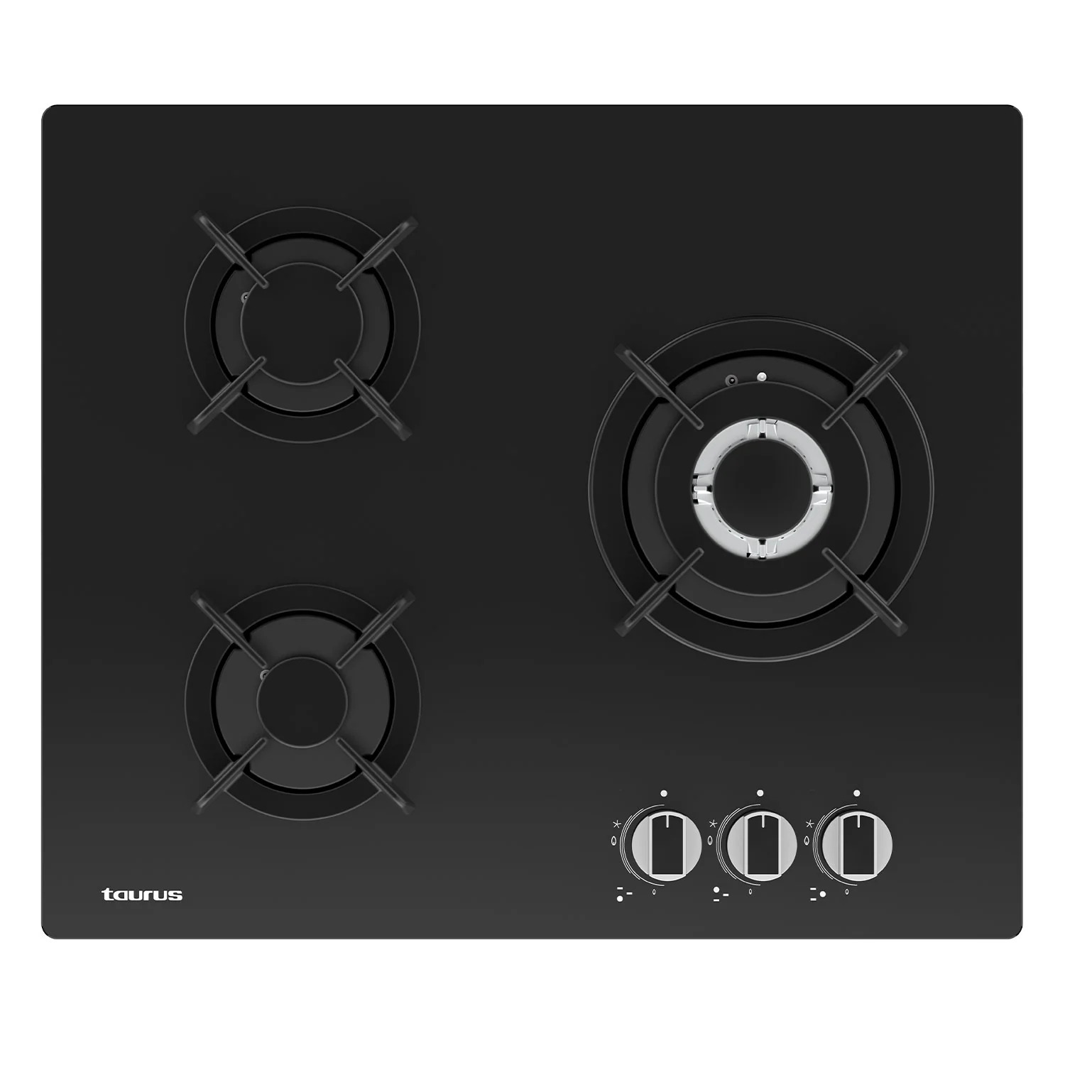 ? Cristal templado de 8mm ? Soporte del menaje: Hierro fundido ? Preparado para gas natural ? Kit de intercambio a Gas Butano ? Quemadores de aluminio ? 3 quemadores ? Quemador triple Wok (3.5kW) ? Quemador semi-rápido (1,8kW) ? Quemador auxiliar (1,05kW) ? 6,35kW potencia total equivalente ? Autoignición piezoeléctrica ? Tapas de acero esmaltado mate