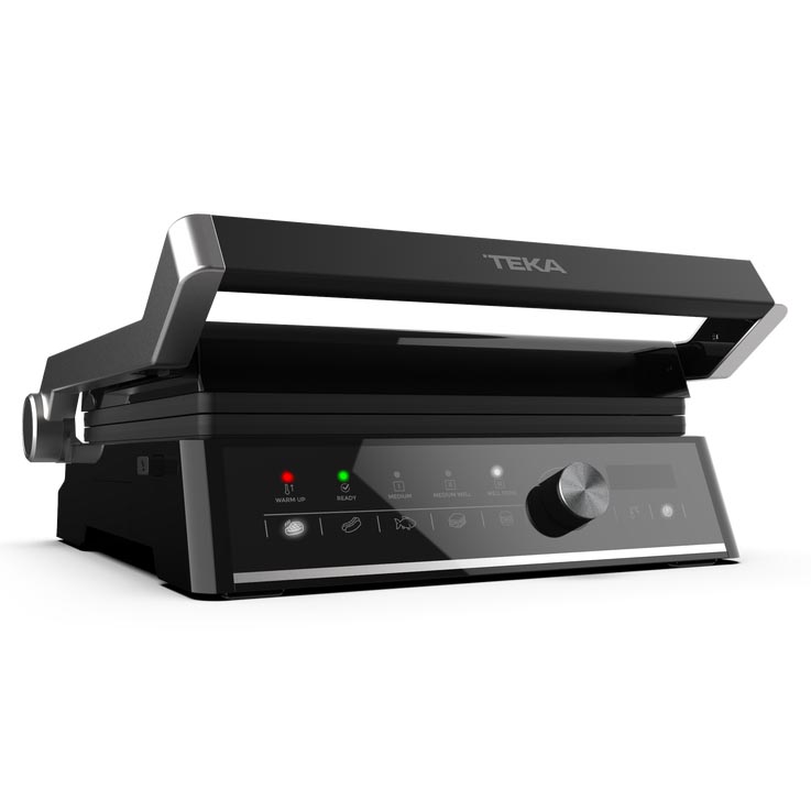 Grill eléctrico multifuncion de libre instalación ? Estructura metálica ? Panel táctil con indicador de temperatura ? Regulación de temperatura por mando 150-230 ºC ? 5 programas automaticos (Carnes, salchichas, pescados, sándwiches y hamburguesas) ? 3 niveles de acabado (Medio, Hecho, Muy hecho) ? Tapa superior ajustable ? Apertura 180º para una gran superficie de cocinado ? 2 planchas de 28,5 x 22,5 cm ? Planchas Easy Clean desmontables con revestimiento antiadherente y aptas para lavavajillas ? Bandeja recoge grasas ? Piloto indicativo de calentamiento