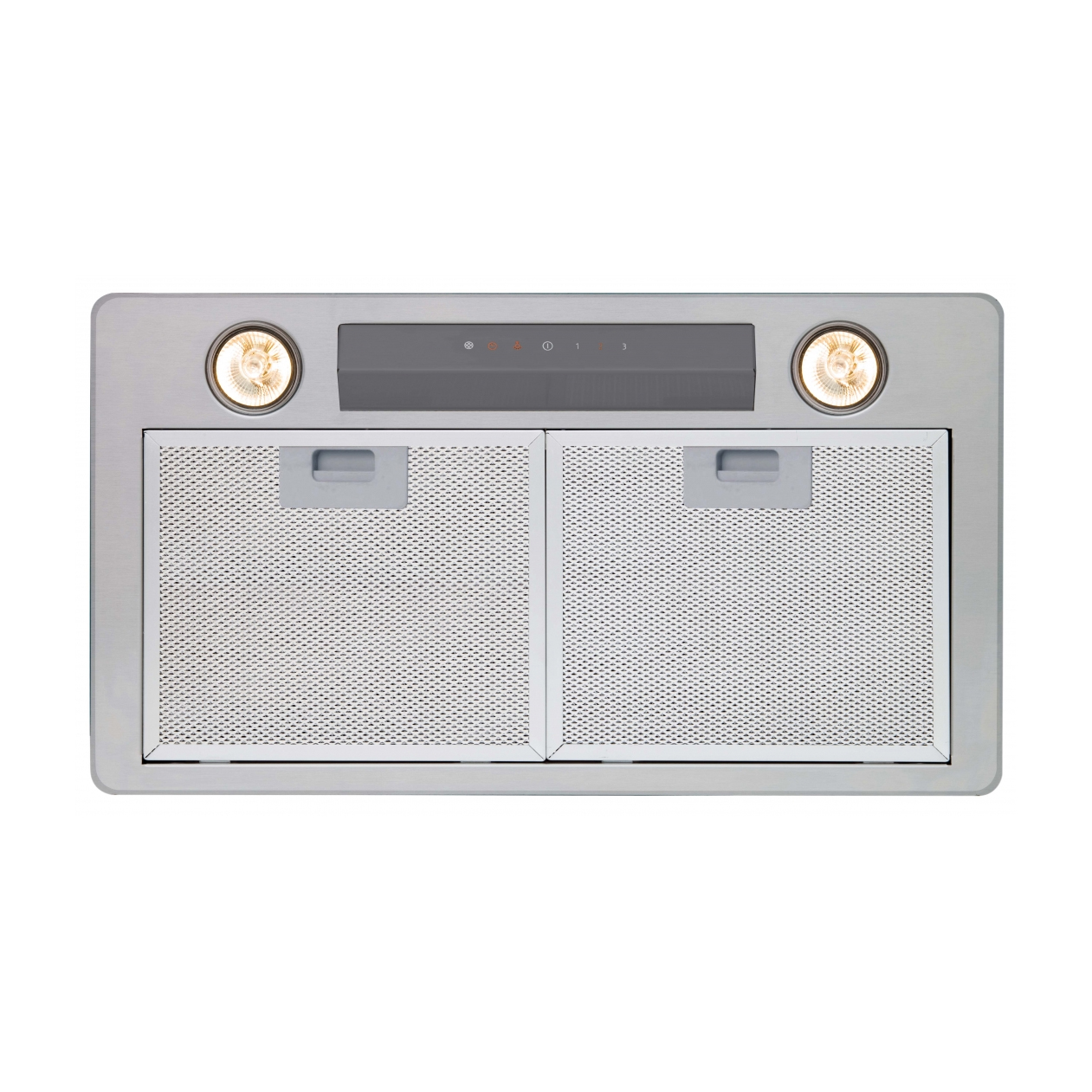 Grupo filtrante para mueble de 792x277mm (encastre 754x253x315mm) con acabado en inox. Panel de Control Táctil con temporizador de desconexión automática e indicador de limpieza de filtros. 4 niveles de extracción, 3 + 1 TURBO. Capacidad de extracción máxima ? mínima (Reg.(UE) nº65/2014): 850m3/h – 340m3/h. Nivel sonoro (Reg.(UE) nº65/2014): 50dB(A), máximo: 65dB(A). Motor BT3. Extra silencioso. Consumo máximo de energía 280W. Iluminación de alta eficiencia mediante LEDs, regulables en intensidad. Sistema de fácil instalación. Filtros lavables en lavavajillas. Presión max.: 450Pa – Presión TURBO: 470 Pa. Descarga 150/125 mm. Clase de eficiencia energética: A