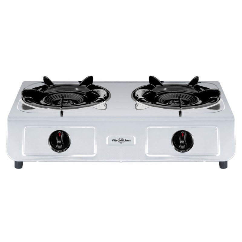 Cuerpo acero inoxidable. 2 Quemadores de acero inoxidable de alta potencia. Encendido electrónico incorporado en mando. Parrilla de acero esmaltada. Patas antideslizantes. Medidas: 37 x 60 x 12 cm. Unidades embalaje: 1. Incorpora reductor para utensilios pequeños