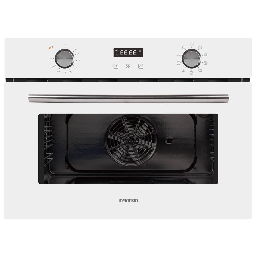 Horno multifunción BLANCO, 45 Litros, 9 funciones, clasificación energética A, Puerta de doble acristalamiento, Display Led, potencia 2300 – 2750 W1, rango de temperatura 50 – 250ºC, Dimensiones: 45,5 x 59,5 x 56,5 cm , Medida de Encastre: 44,8 x 56 x 55 cm