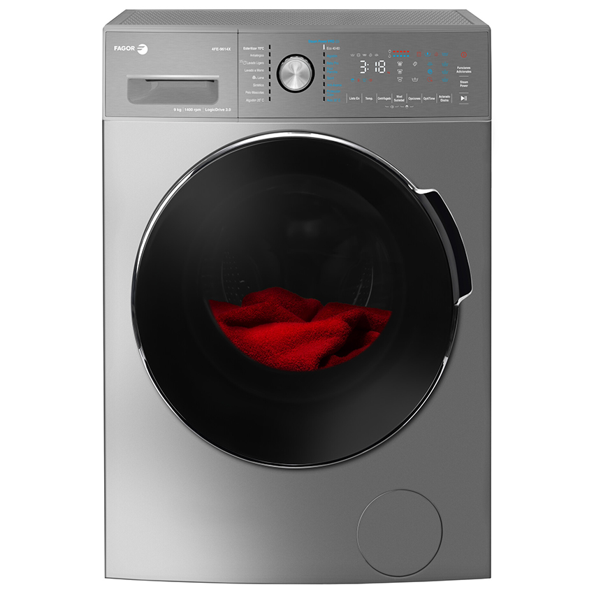 Lavadora Inoxidable de Libre Instalación | Control Electrónico Gran Display Full Touch | 20 programas | Selector de tiempo y energia Optime | Autolimpieza, Inicio Diferido, Añadir Prenda, Lavado Rápido | 9 kg de Carga | 1.400 rpm | Lavado Vapor Steam Touch | Recirculacion de agua EasyJet | Motor BLDC de alta eficiencia | Puerta con Protector Térmico Decorativo y Ojo de Buey de 31 cm | Clase Energética B