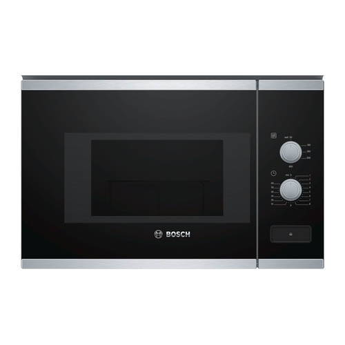 BOSCH, BFL520MS0, Microondas, electrónico, Encastrable sin marco, 38 cm., 20 l., 5 F, Ap. lateral izquierda, Cristal negro/inox, Mecánico, Con plato giratorio 25,5 cm., Mandos fijos, Sin grill.