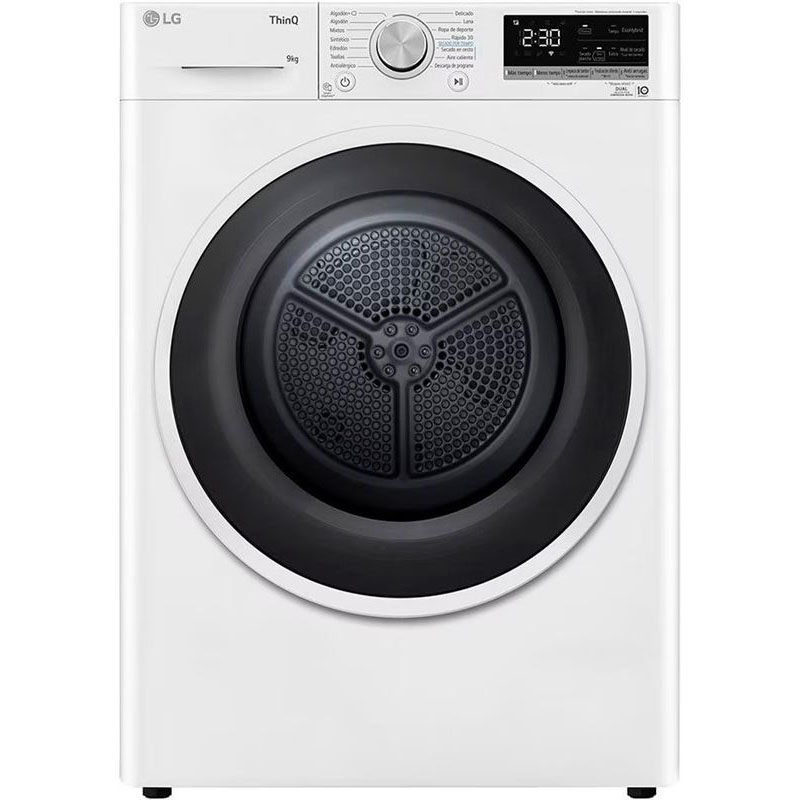 La secadora LG RH90V5AV6N bomba de calor Dual Inverter proporciona un secado con la máxima eficiencia energética en el menor tiempo posible. Eco Hybrid? Ahorro de energía o ahorro de tiempo La tecnología Eco Hybrid? te permite seleccionar ahorrar energía o tiempo según tus necesidades. Limpieza automática del condensador Ayuda a mantener el buen funcionamiento y rendimiento en el secado gracias a la limpieza automática del condensador. Cuidado antialergias. Reduce el 99,9% de los ácaros del polvo doméstico vivo El ciclo Antialergia reduce el 99,9% de los ácaros del polvo doméstico. Ideal para personas con alergias o dermatitis. Puerta reversible. Se adapta a tus necesidades La puerta se puede instalar con apertura hacia el lado derecho o izquierdo en función de tus necesidades. Lavadora y secadora conectadas cuidando de tu ropa Puedes configurar el ciclo de secado adecuado, descargar programas adicionales, controlar de forma remota tu secadora y ahorrar tiempo y dinero gracias a su sistema de autodiagnóstico. Smart Pairing. Conecta tu lavadora y tu secadora al wifi Tu secadora te sugerirá el programa óptimo para tu colada en base al programa y al patrón de lavado que hayas elegido en tu lavadora previamen SE PUEDE CAMBIAR EL SENTIDO DE APERTURA DE LA PUERTA