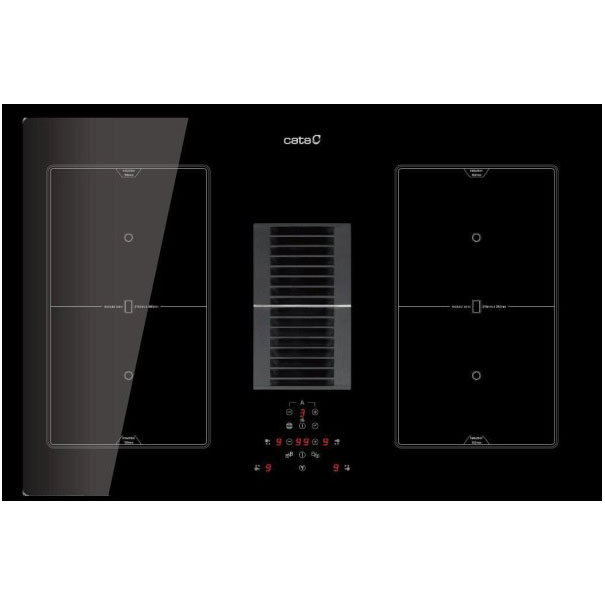 Panel de Control Táctil con temporizador de desconexión automática e indicador de limpieza de filtros 6 niveles de extracción, 5 + 1 TURBO Capacidad de extracción máxima ? mínima (Reg.(UE) nº65/2014): 580m3/h – 200m3/h Velocidad aspiración aire: 10 m/s Nivel sonoro (Reg.(UE) nº65/2014): 45dB(A), máximo: 64dB(A) Motor Brushless. Extra silencioso. Consumo máximo de energía 135W Sistema de fácil instalación Filtros lavables en lavavajillas Presión max.: 357 Pa – Presión Turbo: 365 Pa Descarga 150 mm Clase energética: A 4 zonas de cocción: Delantera Derecha: 1 zona con función Booster de 215 x 190mm de 1,6 kW (máx. 1,85kW) Trasera Derecha: 1 zona con función Booster de 215 x 190mm de 2,1 kW (máx. 3kW) Delantera Izquierda: 1 zona con función Booster de 215 x 190mm de 1,6 kW (máx. 1,85kW) Trasera Izquierda: 1 zona con función Booster de 215 x 190mm de 2,1 kW (máx. 3kW) 2 zonas modulares de 215 x 380mm de 3,7kW Control táctil deslizante con avisador acústico 9 niveles de potencia regulables + Booster Función temporizador para cada zona Alarma de cuenta atrás Detección automática de recipientes Bloqueo de seguridad Indicador de calor residual Desconexión automática de seguridad Bisel frontal Ancho de 77cm Potencia total (inducción+extracción) 7,47kW