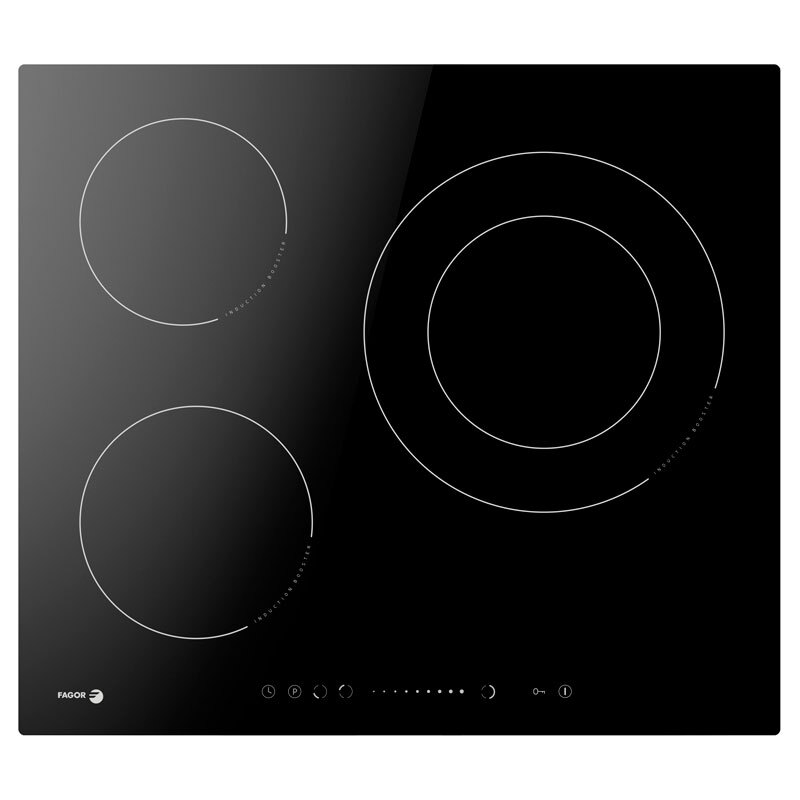 Encimera Inducción ? 3 zonas ? Cristal Schott corte recto ? Zona Grande 280 mm ? Control Electrónico Slider ? Temporizador ? 9 niveles de Potencia ? Booster de Potencia en las 3 zonas ? Bloqueo Seguridad ? Detector de utensilio ? Indicador de Calor Residual ? Potencia total 7,2 kW ? 1 Zona Doble Grande 180/280 mm 3,0 / 3,6kW (Booster) ? 1 zona de 180 mm 1,8 2,1 kW ? 1 zona de 160 mm 1,2 1,5 kW ? Medidas aparato (mm) ? Alto: 58 ? Ancho: 590 ? Fondo: 520 ? Medidas Encastre (mm)