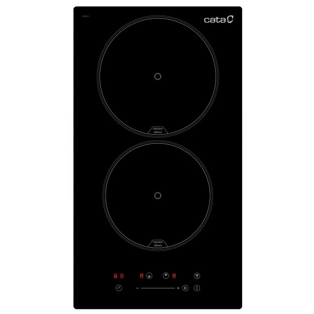 Placa de inducción de 290x520mm (encastre 265x495mm) cristal negro de 3,5kW de potencia con 2 zonas de cocción. Delantera: 1 zona con función Booster de ø180mm de 1,2kW (máx. 1,5kW). Trasera: 1 zona con función Booster de ø200mm de 2kW (máx. 2,3kW). Control táctil deslizante con avisador acústico. 9 niveles de potencia regulables + Booster. Función temporizador para cada zona. Alarma de cuenta atrás. Detección automática de recipientes. Bloqueo de seguridad. Indicador de calor residual. Desconexión automática de seguridad.